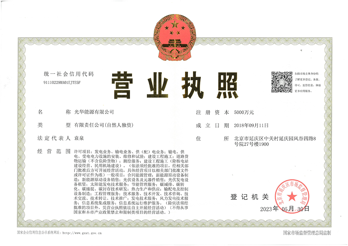 光華能源有限公司是一家專注于太陽(yáng)能、風(fēng)能、儲(chǔ)能、氫能的銷售企業(yè)。公司致力于為客戶提供售電、光伏電站、儲(chǔ)能站、充電站等綜合能源服務(wù)的一站式技術(shù)解決方案。公司總部位于北京。公司核心團(tuán)隊(duì)具有豐富的能源系統(tǒng)經(jīng)驗(yàn),憑借對(duì)能源業(yè)務(wù)的深刻理解及經(jīng)驗(yàn)豐富的執(zhí)行團(tuán)隊(duì),優(yōu)異的整體解決方案及完善的開(kāi)放式系統(tǒng)架構(gòu),公司平臺(tái)得到了廣大用戶的認(rèn)可。